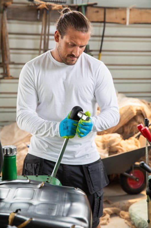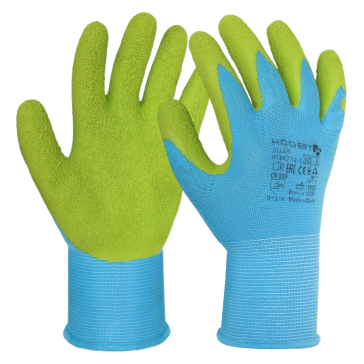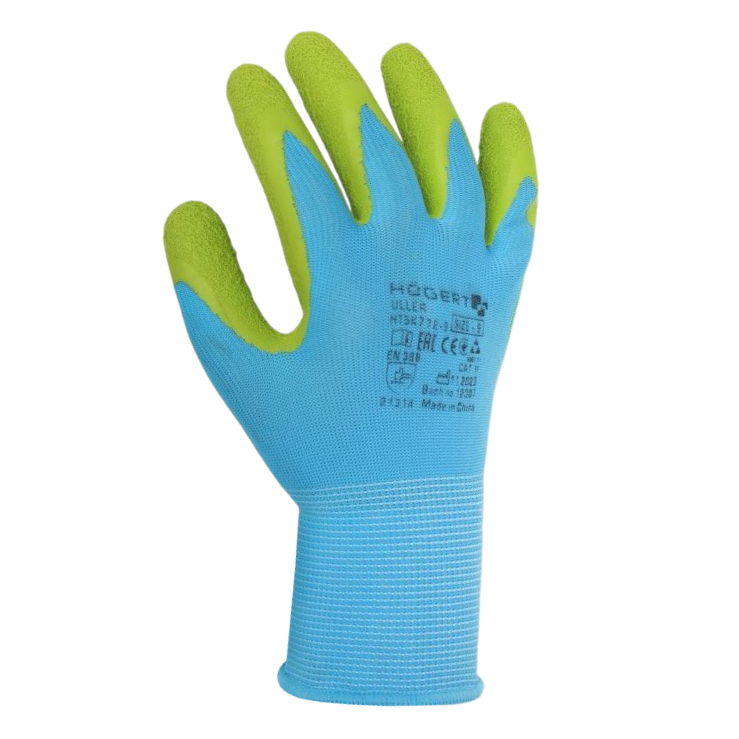 RĘKAWICE POWLEKANE LATEKSEM Högert ULLER. Rękawice ULLER, powlekane karbowanym lateksem, oferują znakomitą ochronę przed zagrożeniami mechanicznymi przy jednoczesnym zapewnieniu wysokiego komfortu użytkowania. Ich niebiesko-zielona kolorystyka dodaje stylu i wizualnej atrakcyjności, podczas gdy dzianina poliestrowa o uigleniu 13 zapewnia elastyczność i wytrzymałość. Są idealnym rozwiązaniem dla osób poszukujących ochrony rąk w różnorodnych aktywnościach, włączając prace domowe oraz różnego rodzaju zadania zręcznościowe. Kolor: podkład - niebieski, powłoka - zielony. Materiał: podkład - poliester, uiglenie 13, powłoka - karbowany lateks. Konstrukcja: model pięciopalcowy, bezszwowy, powlekany warstwą porowatego lateksu w części wewnętrznej dłoni i palców, elastyczny mankiet zwiększający dopasowanie do dłoni i zapobiegający zsuwaniu. Zastosowanie: rękawice do wielokrotnego użytku, budownictwo, przemysł transportowy, przy precyzyjnych pracach montażowych, logistyka, magazyn.