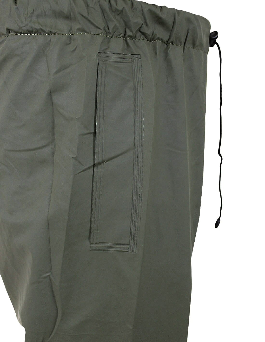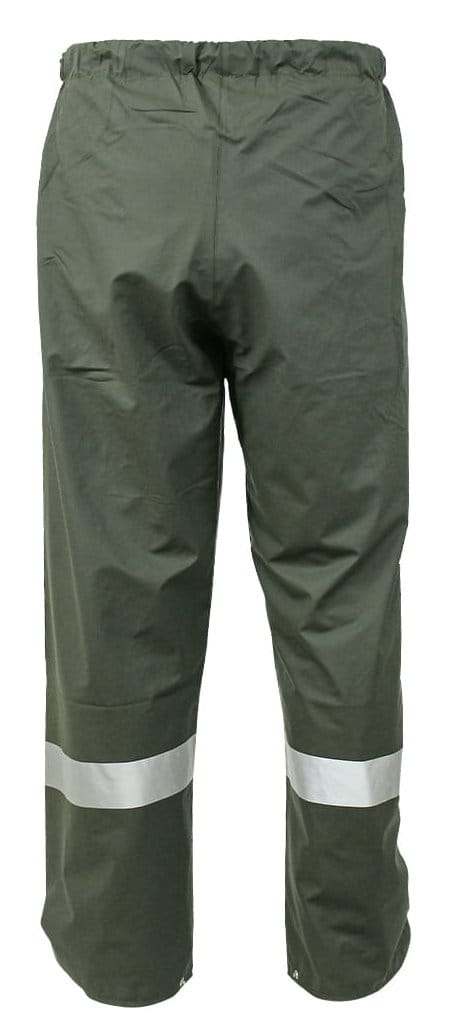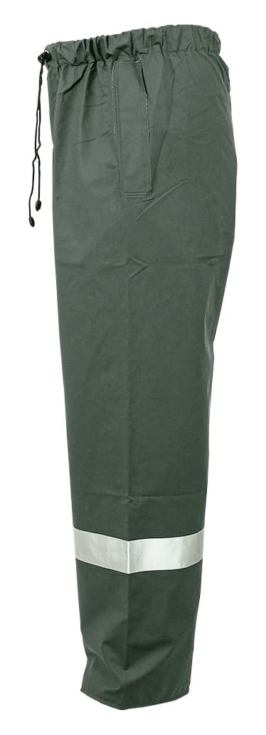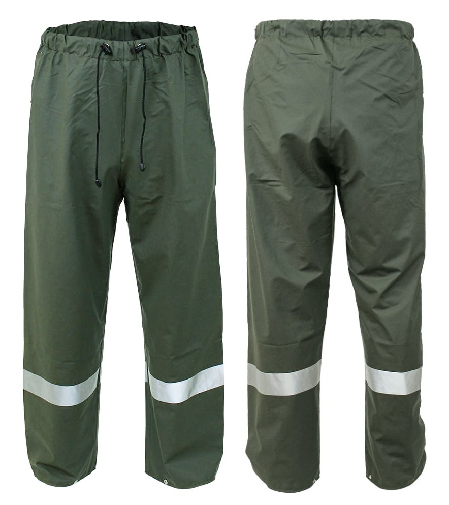SPODNIE WODOOCHRONNE PROS MODEL 4091 OLIWKOWE. Spodnie do pasa wykonane z mieszanki materiału PCV i PU, charakteryzującego się lekkością, wytrzymałością oraz odpornością na oleje i substancje ropopochodne. Odzież przeznaczona do użytku w niesprzyjających warunkach pogodowych, zapewniają skuteczną ochronę przed wiatrem i deszczem a taśmy odblaskowe dodatkowo poprawiają bezpieczeństwo użytkownika, zwiększając jego widoczność. Do kompletu: kurtka model 4090 i płaszcz model 4092. Kolor: oliwkowy. Rozmiar: XS/48-4XL/62. Materiał: AQUAPROOF BASIC, 180 g/m2. Konstrukcja: spodnie do pasa z elastycznym pasem regulowanym sznurkiem ze stoperami, nogawki z regulacją szerokości za pomocą nap, kieszenie i poziome pasy odblaskowe na nogawkach, obustronnie zgrzewane szwy. Zastosowanie: przemysł metalurgiczny, elektromaszynowy, przemysł spożywczy, budownictwo, rolnictwo, ogrodnictwo, wędkarstwo i rybołówstwo.
