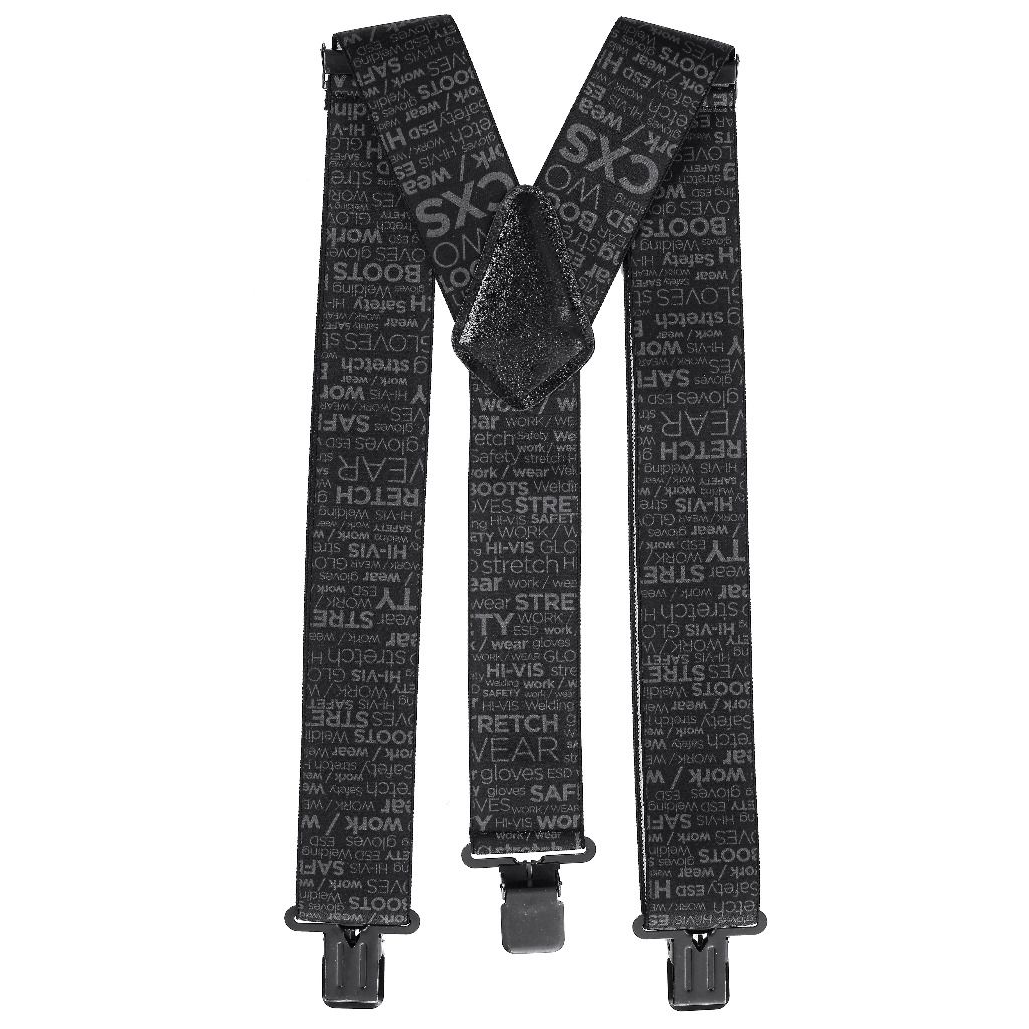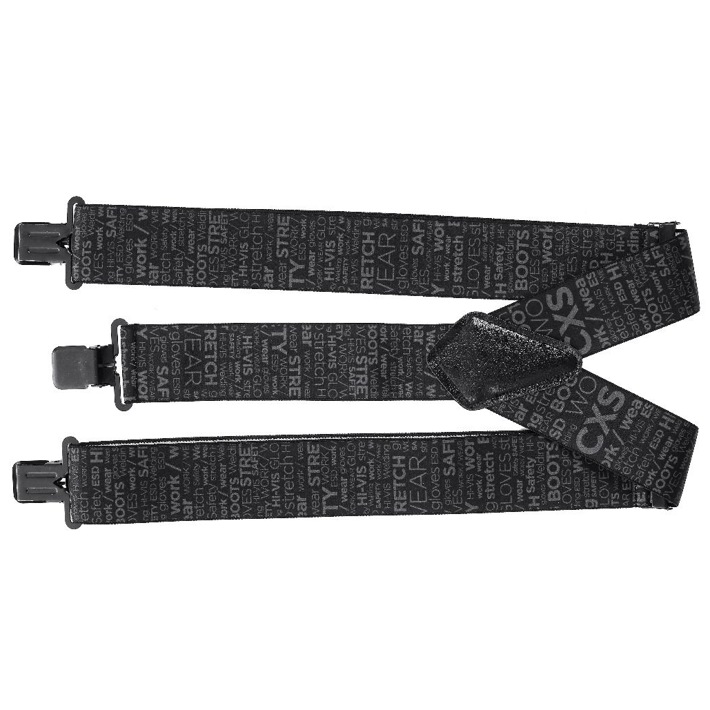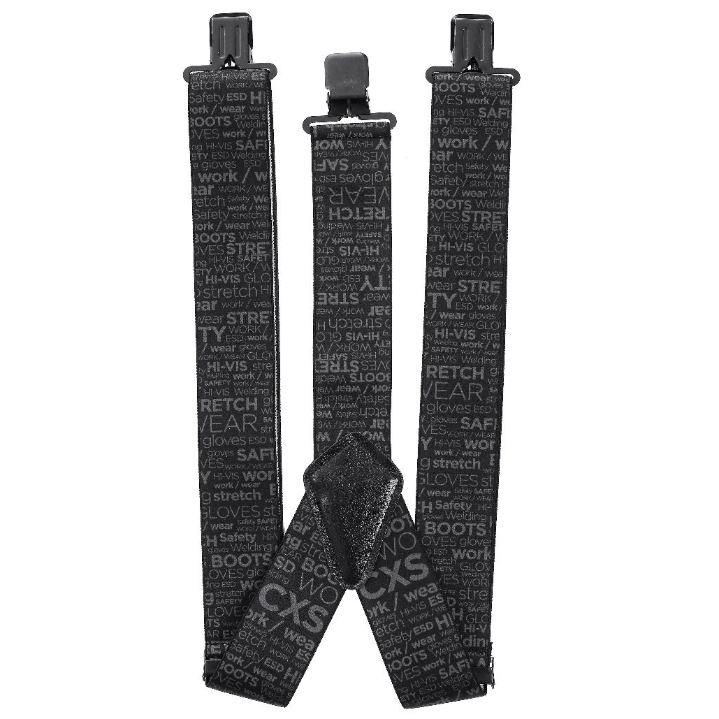 - KONSTRUKCJA: szelki mają kształt litery Y, co oznacza, że z przodu posiadają dwa pasy, które z tyłu łączą się w jeden, złączenie z tyłu wykonane jest z elementu zapewniającego trwałość i stabilność, główna taśma wykonana jest z elastycznego materiału (mieszanka poliestru i gumy), co pozwala na dopasowanie do ciała i zapewnia komfort podczas noszenia, domieszka gumy (25%) zapewnia rozciągliwość i dobre trzymanie w trakcie ruchu, każda z trzech końcówek szelek zakończona jest klipsem zaciskowym, który umożliwia łatwe przymocowanie szelek do spodni roboczych, cała taśma ma czarny kolor z szarym, powtarzającym się nadrukiem zawierającym hasła związane z odzieżą roboczą (np. „CXS”, „WORK”, „SAFETY”, „HI-VIS”, „WELDING”, „STRETCH”, „BOOTS”, „GLOVES” itp.), nadruk jest estetyczny i podkreśla przeznaczenie szelek do zastosowań w środowisku pracy