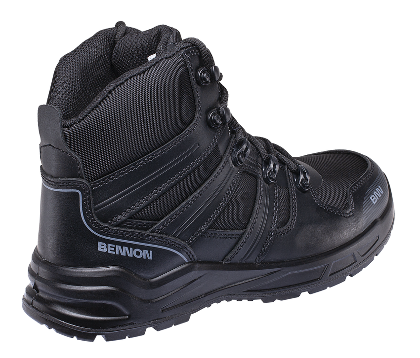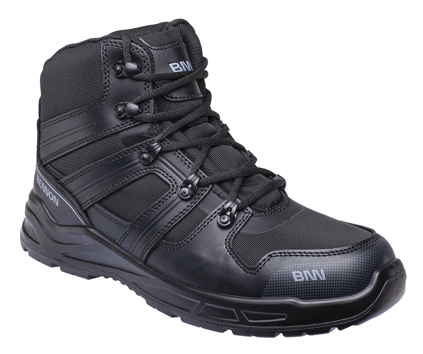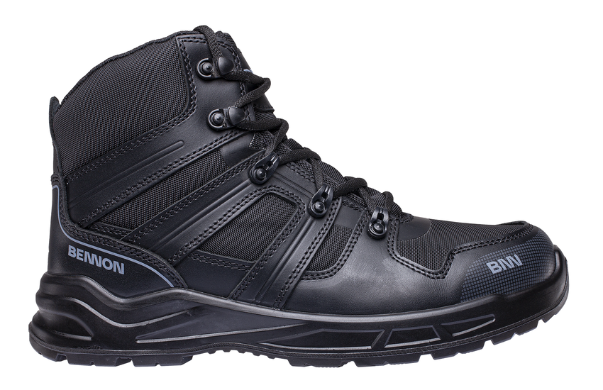 TRZEWIKI BENNON CONDOR O2 NM HIGH. Obuwie robocze z oznaczeniem O2, nie posiada podnoska, ma zabudowaną piętę, właściwości antystatyczne, absorpcję energii w obszarze pięty, odporność podeszwy na oleje, właściwości antypoślizgowe. Nowoczesny styl buta taktycznego, odporne materiały i komfort noszenia w warunkach roboczych (bez obowiązku posiadania ochrony palców) oraz w użytkowaniu codziennym. Kolor: czarny. Rozmiar: 36 - 48. Materiał wierzchni: skóra bydlęca full grain o grubości 1,8–2,0 mm, materiał tekstylny OXFORD, powłoka TPU na palcach, ochrona pięty TPU. Podszewka: materiał tekstylny MESH. Wkładka wewnętrzna: D-Sole. Podeszwa: CRONUS XTR PU/PU. Konstrukcja: wysoka cholewka ze skóry bydlęcej oraz materiału OXFORD, powłoka ochronna TPU na palcach i pięcie, podszewka z czarnego materiału tekstylnego MESH, miękko wykończony kołnierz i język - wypełnienie pianką poliuretanową, szwy czarną nicią poliestrową, dopasowanie za pomocą ściągania sznurówkami - 3 pary plastikowych oczek i 2 pary plastikowych haczyków, czarny kolor, owalne sznurówki z poliestru z plastikowym wykończeniem, wkładka wewnętrzna D-Sole, podeszwa CRONUS XTR PU/PU. Zastosowanie: przeznaczone do uniwersalnego użytku podczas wykonywania pracy (bez obowiązku ochrony palców stóp) oraz do noszenia na co dzień.