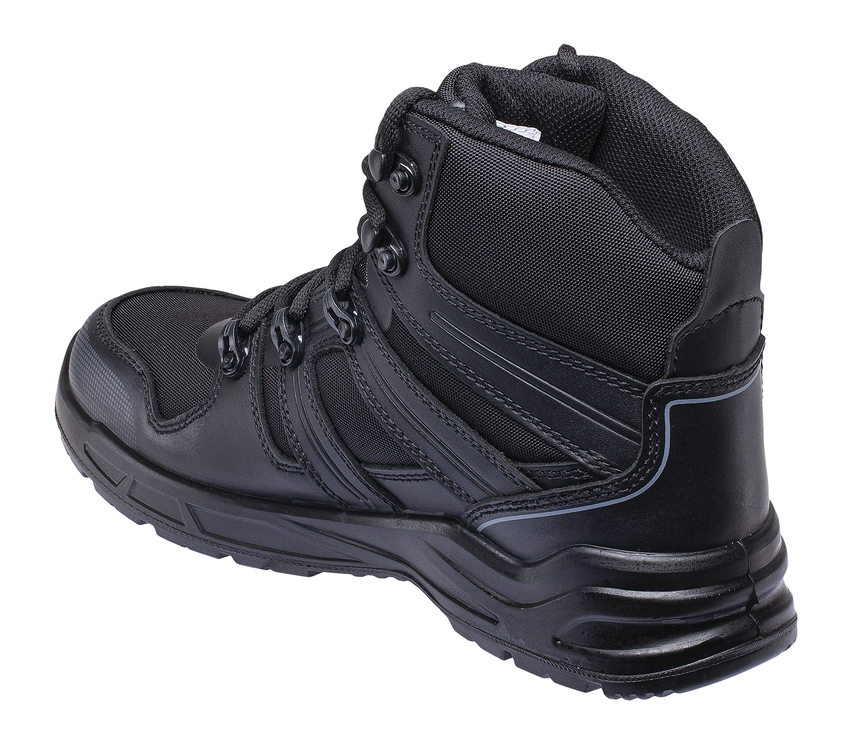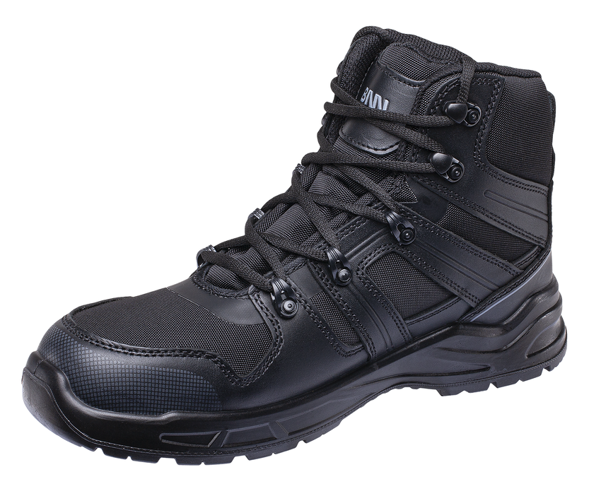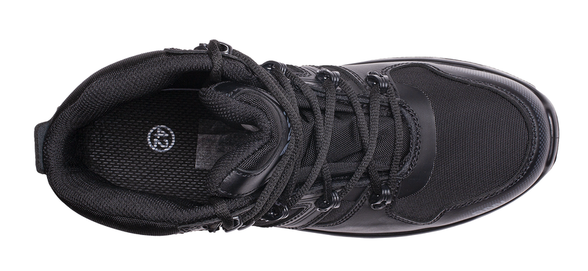 - KONSTRUKCJA: wysoka cholewka ze skóry bydlęcej oraz materiału OXFORD, powłoka ochronna TPU na palcach i pięcie, podszewka z czarnego materiału tekstylnego MESH, miękko wykończony kołnierz i język - wypełnienie pianką poliuretanową, szwy czarną nicią poliestrową, dopasowanie za pomocą ściągania sznurówkami - 3 pary plastikowych oczek i 2 pary plastikowych haczyków, czarny kolor, owalne sznurówki z poliestru z plastikowym wykończeniem, wkładka wewnętrzna D-Sole, podeszwa CRONUS XTR PU/PU