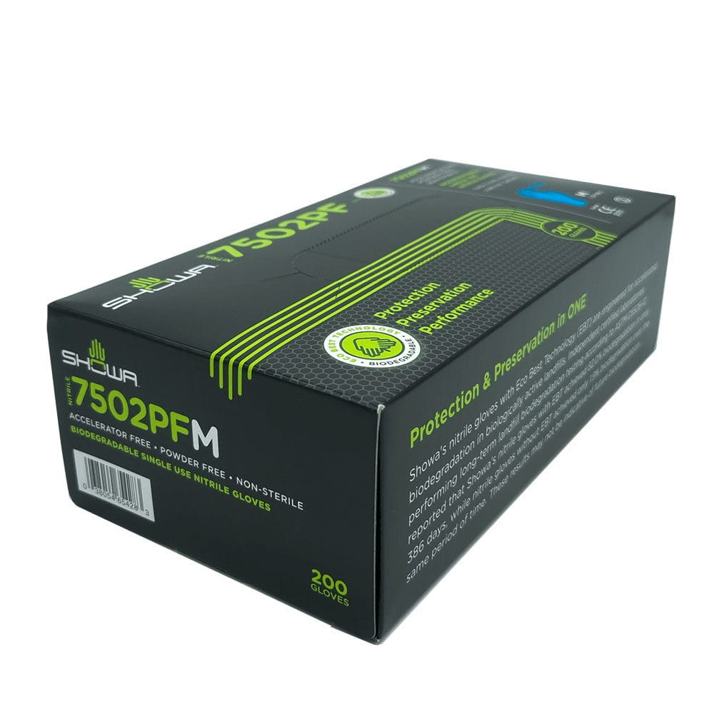 RĘKAWICE NITRYLOWE SHOWA 7502PF NIEBIESKIE (200szt.). Jednorazowe rękawice zaprojektowane dla skóry wrażliwej, nie zawierają pudru, lateksu ani przyspieszaczy. Nitryl o grubości 2,5 mil/0,06mm zapewnia dobrą ochronę chemiczną przed szeroką gamą zagrożeń chemicznych. Dzięki rewolucyjnej technologii Eco Best Technology® (EBT) firmy SHOWA, te rękawice są projektowane z myślą o przyspieszonej biodegradacji na biologicznie aktywnych składowiskach odpadów. Kolor: niebieski. Długość: 240 mm. Grubość: 0.06 mm. Rozmiar: 5-6/XS, 6-7/S, 7-8/M, 8-9/L, 9-10/XL, 10-11/XXL. Technologia: Eco Best Technology® (EBT). Materiał: 100% nitryl. Konstrukcja: model pięciopalcowy, rękawice oburęczne, bezpudrowe, jednorazowe, biodegradowalne, wykonane w 100% z nitrylu, grubość - 0.06mm, długość - 240mm, teksturowane końcówki palców, zwijany mankiet. Zastosowanie: praca z roślinami i warzywami, praca z łagodnymi środkami chemicznymi w ogrodnictwie, rolnictwie, pakowanie i obróbka żywności, usługi gastronomiczne/przygotowanie żywności, mycie i czyszczenie.