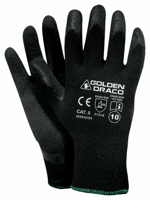 RĘKAWICE POWLEKANE LATEKSEM WORKLINK GOLDEN DRACO SET B. Rękawice dzianinowe powlekane czarnym lateksem. Bawełniana dzianina gwarantuje komfort noszenia nawet przy wielogodzinnym użytkowaniu. Powleczenie lateksem o porowatej strukturze, powoduje doskonałą przyczepność, nie tracąc na swojej elastyczności. Trudnościeralne i odporne na zużycie. Doskonałe do prac ogrodowych i porządkowych. Kolor: czarny. Rozmiar: 8 - 11. Materiał: dzianina bawełniana (ścieg 10), lateksowa powłoka. Konstrukcja: model pięciopalcowy, dzianina bawełniana (ścieg 10) powlekana warstwą porowatego lateksu w części dłonicowej i na czubkach palców, elastyczny mankiet zapobiegający zsuwaniu się rękawicy podczas pracy. Zastosowanie: przemysł transportowy, prace porządkowe, prace ogrodowe, warsztat.