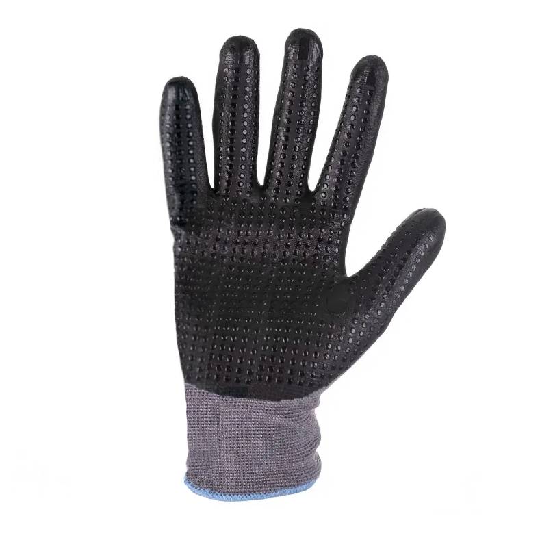 - KONSTRUKCJA: model pięciopalcowy, dzianina - nylon/ elastan - Spandex, splot dzianiny: 15, wnętrze dłoni i palce pokryte pianką nitrylową z oddychającym wykończeniem MICROFOAM, nitrylowe nakrapianie, elastyczny mankiet zapobiegający zsuwaniu się rękawicy podczas pracy