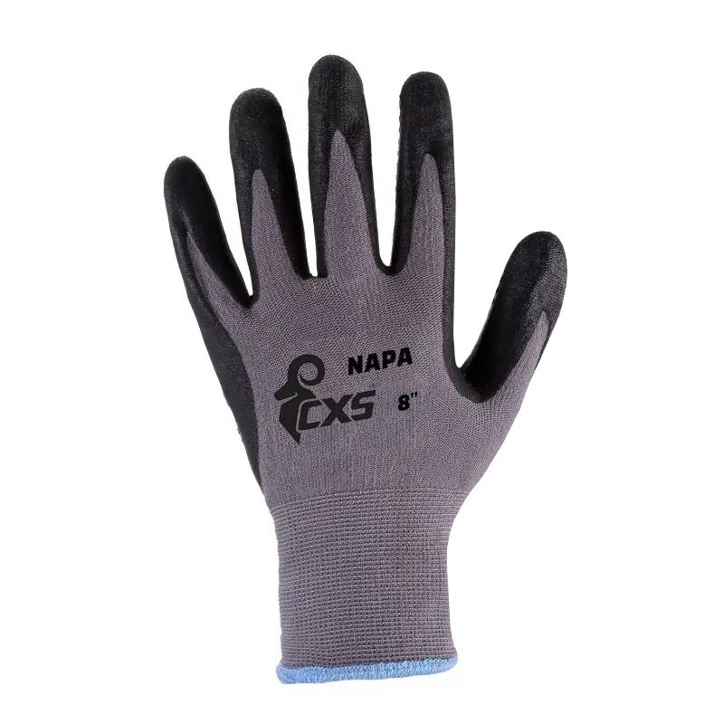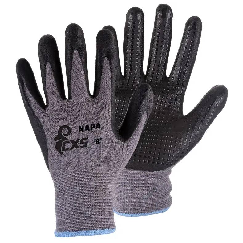 RĘKAWICE POWLEKANE NITRYLEM Z NAKRAPIANIEM CXS NAPA. Rękawice ochronne, bezszwowe, wykonane z delikatnej dzianiny mieszanej, w połowie powlekane pianką nitrylową z nakrapianiem dla wygodniejszego, pewniejszego chwytu. Służą do ochrony rąk przed zanieczyszczeniami i ochrony w środowisku pracy przy pracach z niewielkimi zagrożeniami mechanicznymi (ścieranie, brud...), na przykład: logistyka, magazynowanie, budownictwo, hobby, praca ze śliskimi przedmiotami, przemysł motoryzacyjny, usługi komunalne, ogród, montaż i pakowanie małych elementów. Możliwość pracy z ekranami dotykowymi. Kolor: szaro-czarny. Długość rękawicy: 23 - 26 cm. Rozmiar: 7 - 10. Materiał: wyściółka - nylon/ elastan (Spandex), powłoka - pianka nitrylowa, MICROFOAM wykończenie, nitrylowe nakrapianie. Konstrukcja: model pięciopalcowy, dzianina - nylon/ elastan - Spandex, uiglenie 15, wnętrze dłoni i palce pokryte pianką nitrylową z oddychającym wykończeniem MICROFOAM, nitrylowe nakrapianie, elastyczny mankiet zapobiegający zsuwaniu się rękawicy podczas pracy. Zastosowanie: przemysł samochodowy, logistyka, magazyn, hobby, praca z śliskimi przedmiotami, ogród, budownictwo, usługi komunalne, montaż i pakowanie małych części.