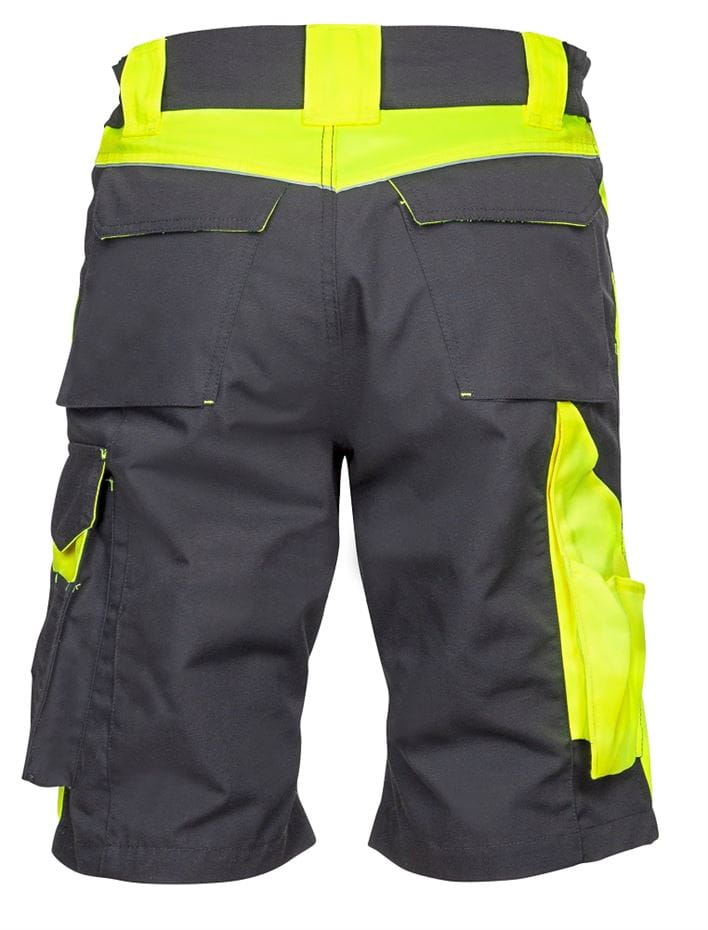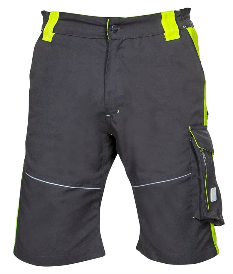 KRÓTKIE SPODENKI ROBOCZE ARDON® NEON. Krótkie spodenki robocze w sportowym stylu, z wielofunkcyjnymi kieszeniami. Kolor: czarno-żółty. Rozmiar: 46-66. Materiał wierzchni: 65% poliester, 35% bawełna canvas, 270 g/m2 . Konstrukcja: krótkie spodenki męskie, elastyczna lamówka w pasie ze zintegrowaną gumą, potrójne szwy w okolicach narażanych na duże obciążenie, główne zapięcie na zamek błyskawiczny, zapięcie na guzik, dwie przednie kieszenie przelotowe, dwie kieszenie tylne z patką, duża kieszeń przelotowa na lewej nogawce osłonięta patką, jedna kieszeń z suwakiem na telefon, kieszeń na nóż łamany, śrubokręt i ołówki stolarskie, na prawej nogawce kieszeń na składaną miarkę, śrubokręt i nóż łamany, fason spodenek z podwójną częścią w strefie kolan i kieszenią na nakolanniki, wypustki odblaskowe. Zastosowanie: branża budowlana, montażowa, techniczna, magazyn, logistyka, transport, warsztat, rolnictwo, ogrodnictwo, hobby.