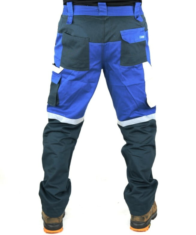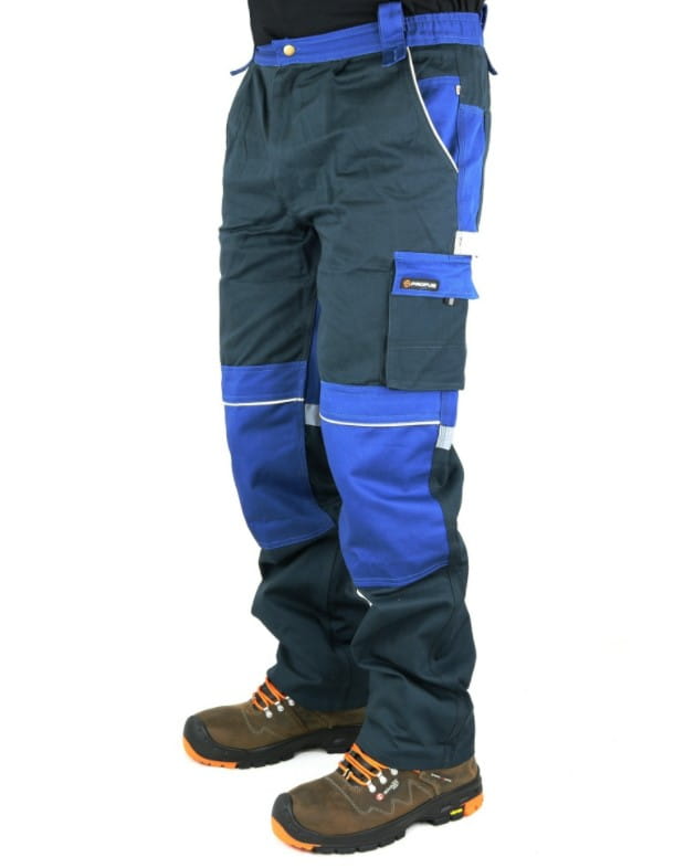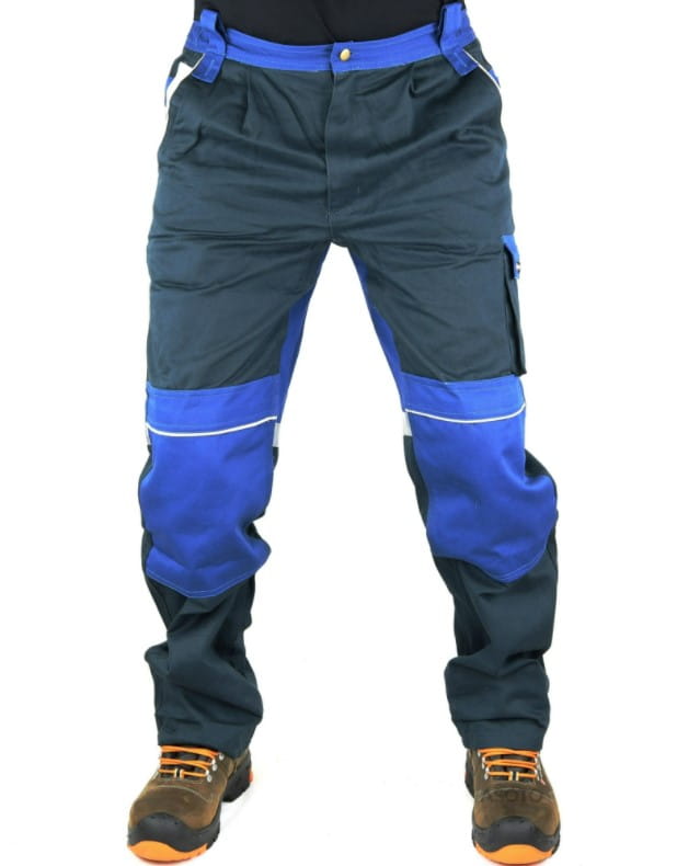 - KONSTRUKCJA: praktyczne spodnie robocze męskie ze 100% bawełny o gramaturze 280g/m2, kolor granatowo-niebieski, wzmocniony na kolanach i kieszeniach poliestrem 600, miejsca najbardziej narażone na rozprucie zabezpieczono potrójnym szwem, wielofunkcyjne kieszenie oraz elastyczne ściągacze, które dopasowują odzież do ciała oraz elementy odblaskowe poprawiające widoczność w słabym świetle