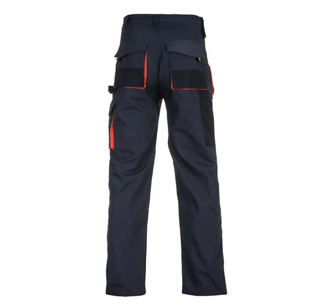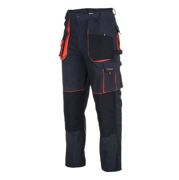 SPODNIE ROBOCZE DO PASA KOLMAR. Praktyczne spodnie robocze przeznaczone do pracy w suchym środowisku. Kolor: grafitowo-czarny z pomarańczowymi wstawkami. Materiał: 65% poliestru, 35% bawełny, 280 g/m2. Konstrukcja: spodnie do pasa, wykonane z materiału pozwalającego na pełną swobodę ruchów, spodnie wzmocnione na kolanach i kieszeniach poliestrem 600D, miejsca najbardziej narażone na rozprucie zabezpieczono potrójnym szwem, spodnie wyposażono w wielofunkcyjne kieszenie wzmocnione ryglówkami oraz elastyczne ściągacze, które dopasowują odzież do ciała, na kolanach kieszenie na wkładki nakolannikowe. Zastosowanie: w branży budowlanej, montażowo-instalacyjnej, do prac magazynowych, porządkowych, warsztatowych, motoryzacyjnych.
